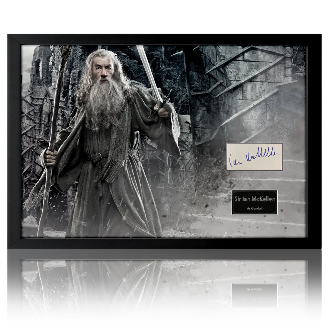 A wonderful framed display of Gandalf the Grey from the Tolkien film series. This presentation contains a white card signed by Sir Ian McKellen who portrays Mithrandir in the film series, and would make a great addition to any film collection. This also comes with additional authenticity from ACOA