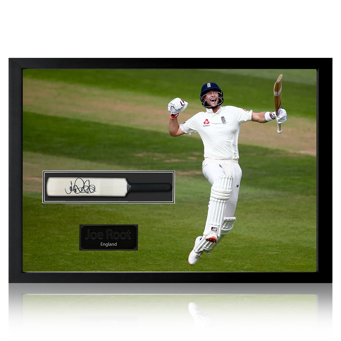Framed mini cricket bat display with a custom engraved plaque. Contains a mini bat signed by England cricket legend, Joe Root. This would make a great addition to any cricket collection. This item measures approximately 690mm x 480mm. Signed as part of a private signing with The Fan Cave on 15th September 2025!