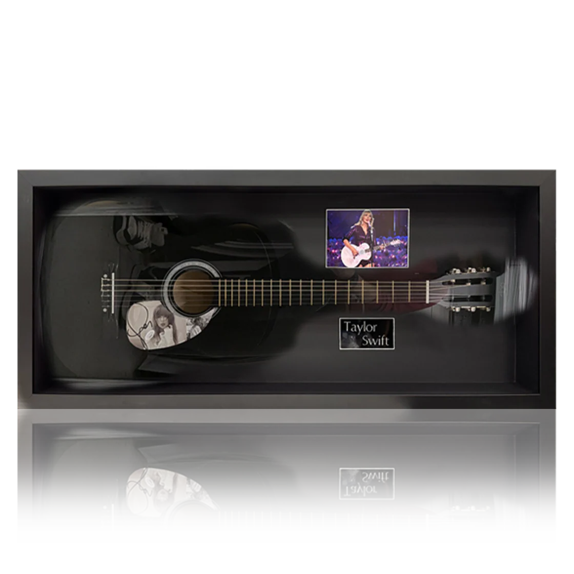 Own a piece of music history with this stunning Taylor Swift signed guitar display. Featuring a beautifully framed black acoustic guitar, complete with custom graphics and an image of Taylor performing live, this collectible is perfect for any Swiftie or memorabilia enthusiast. Elegantly showcased in a sleek shadow box, it makes an eye-catching centerpiece for your home, office, or music room. A must-have treasure celebrating the artistry and legacy of Taylor Swift.