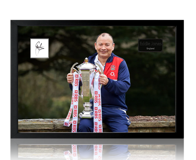 Eddie Jones signed index card in a Iconic Frame. This would make a great addition to any Rugby collection. This item measures approximately 690mm x 480mm.