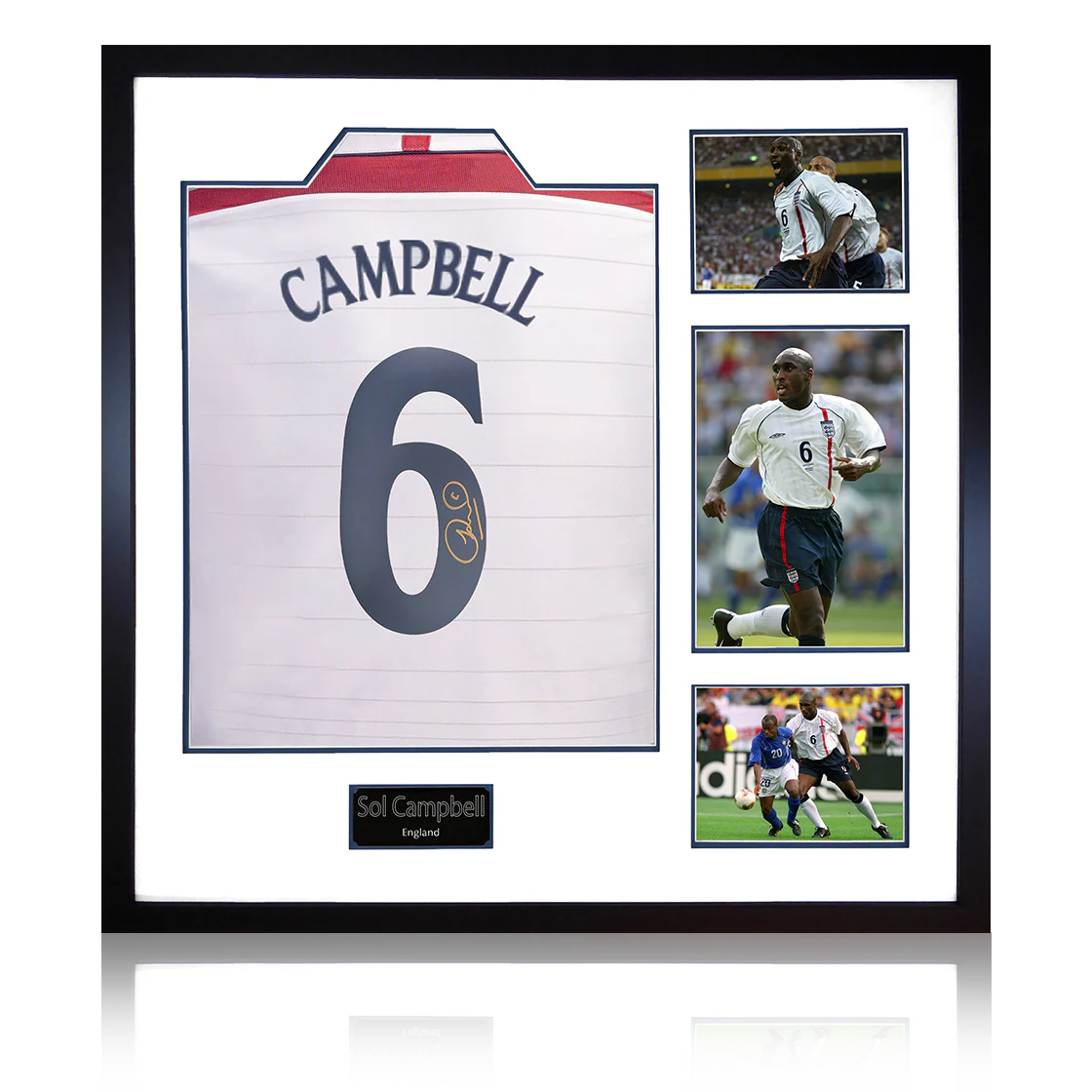 A signed England shirt by Sol Campbell in an Elite Frame. Measuring Approx. 820mm x 820mm