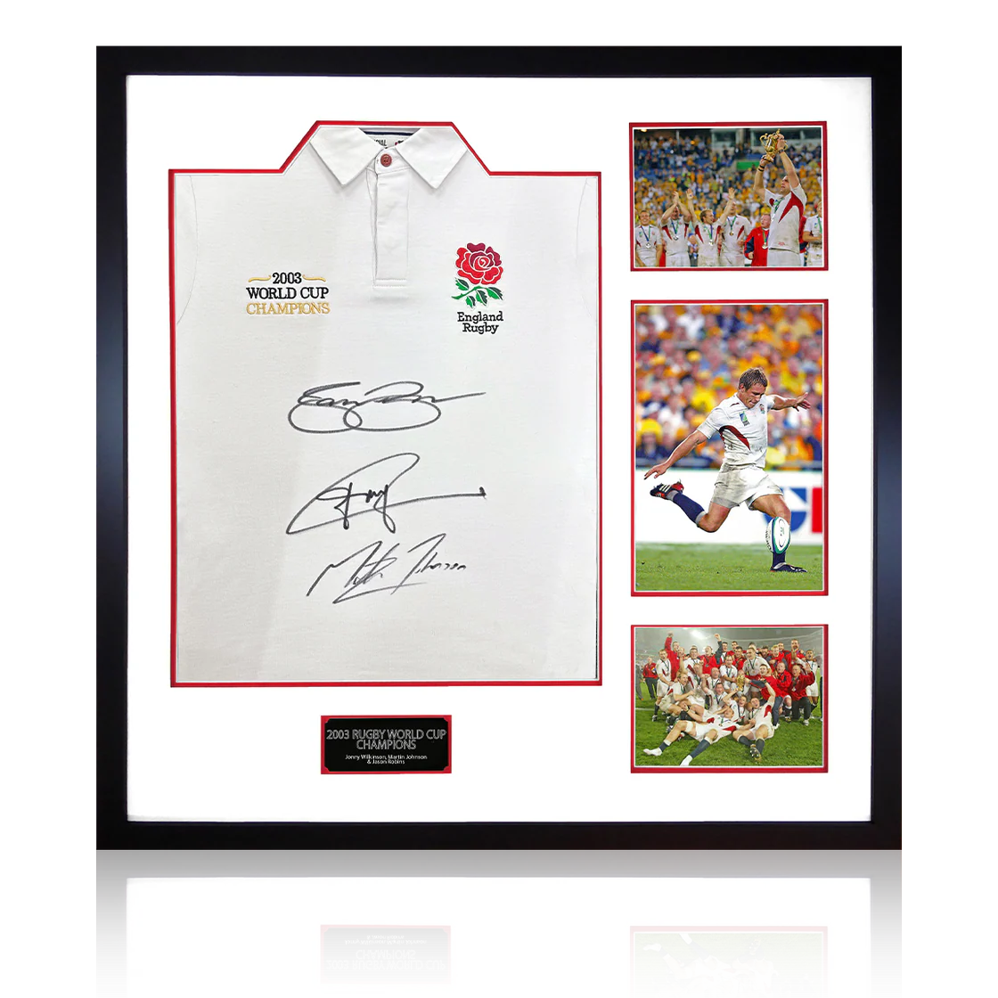 Wood framed rugby shirt display signed by 2003 World Cup Winners; Martin Johnson, Jason Robinson and Jonny Wilkinson. England would win their first Rugby World Championship beating Australia 20-17 in the final game of the tournament. This presentation includes an etched plaque and 3 iconic photos from that victory.